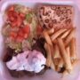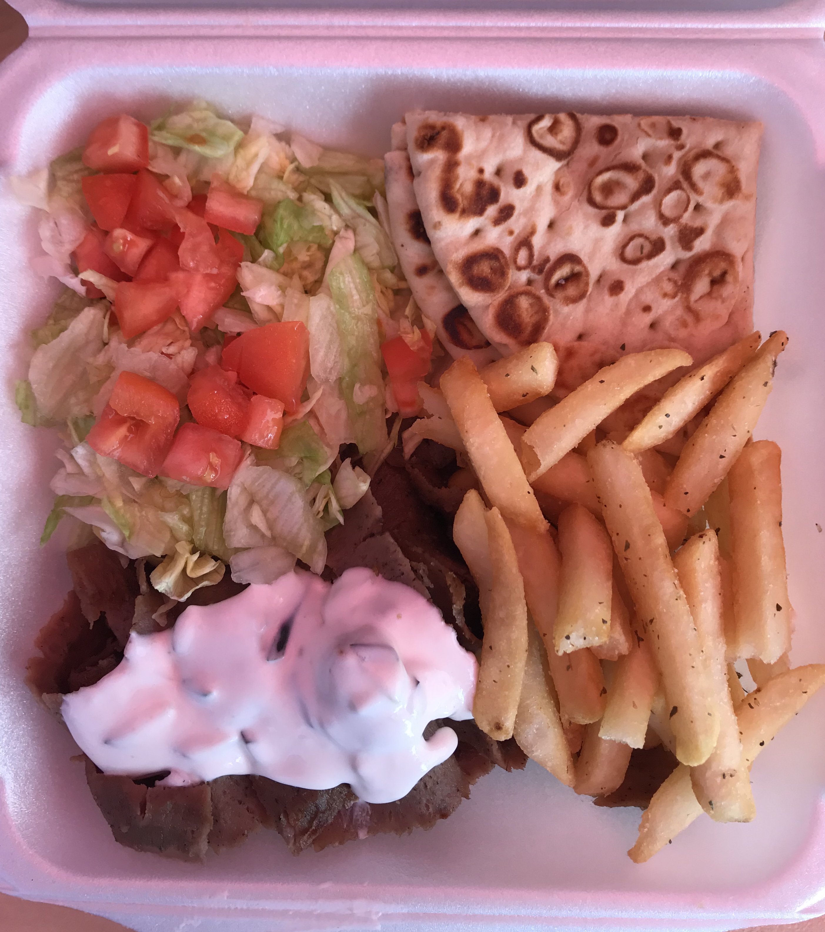 Sliced combined beef and lamb meat open sandwich, french fries and pita bread.