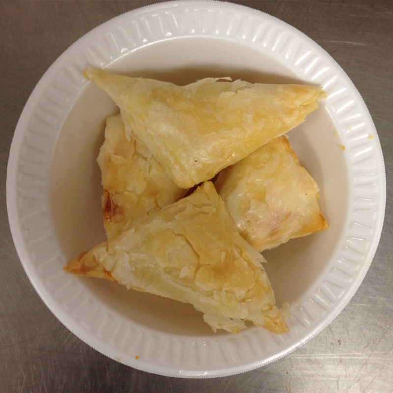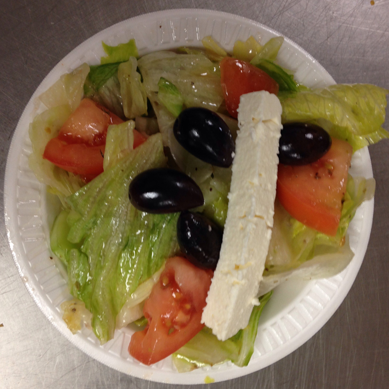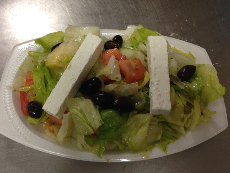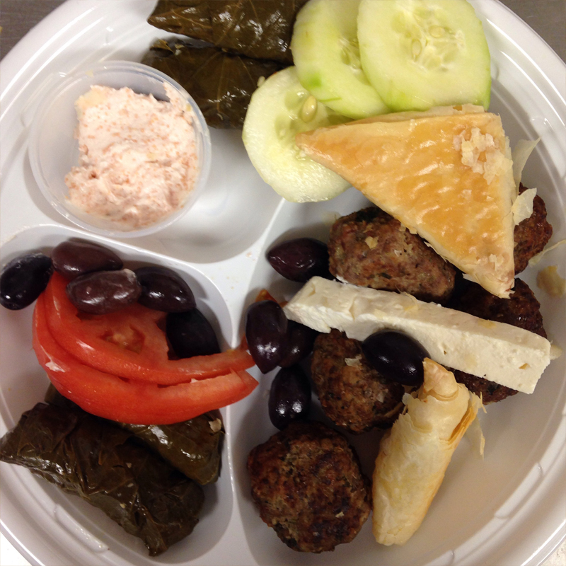 Mousaka (baked eggplant), pastistio (Greek baked macaroni), spanakopita (spinach and feta pie) with salad and bread.