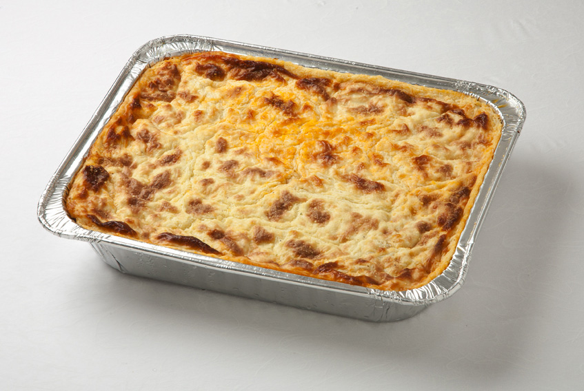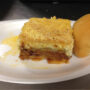 Greek-style baked macaroni with meat filling, bechamel sauce, salad and bread.