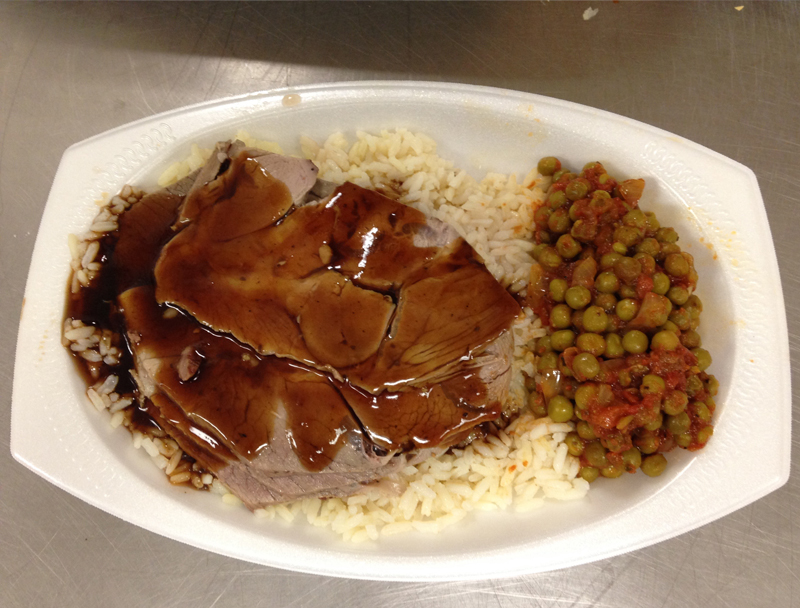 Roasted in lemon sauce with rice pilaf, salad and bread.